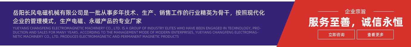 岳陽長風電磁機械有限公司是生產(chǎn)電磁、永磁產(chǎn)品的專業(yè)廠家,傳統(tǒng)產(chǎn)品有:起重電磁鐵、電磁(永磁)除鐵器、電纜(氣體軟管、水纜軟管、鋼絲繩)卷筒、整流控制設備、全免維護停電保磁控制設備、電磁(永磁)輪、高梯度磁選機、電磁攪拌器等;產(chǎn)品型號規(guī)格齊全,市場遍布冶金、機械、電力、交通、礦山、化工、水泥等行業(yè),產(chǎn)品暢銷國內(nèi)二十多個省市自治區(qū),并遠銷于日本、歐美和東南亞等國家。近幾年來,又成功的開發(fā)和研制了磁力開卷器專用型永久磁鐵(電磁鐵)、吸吊鋼帶卷用的高溫起重電磁鐵等高科技產(chǎn)品,深受各大鋼鐵公司薄板生產(chǎn)廠家的青睞。